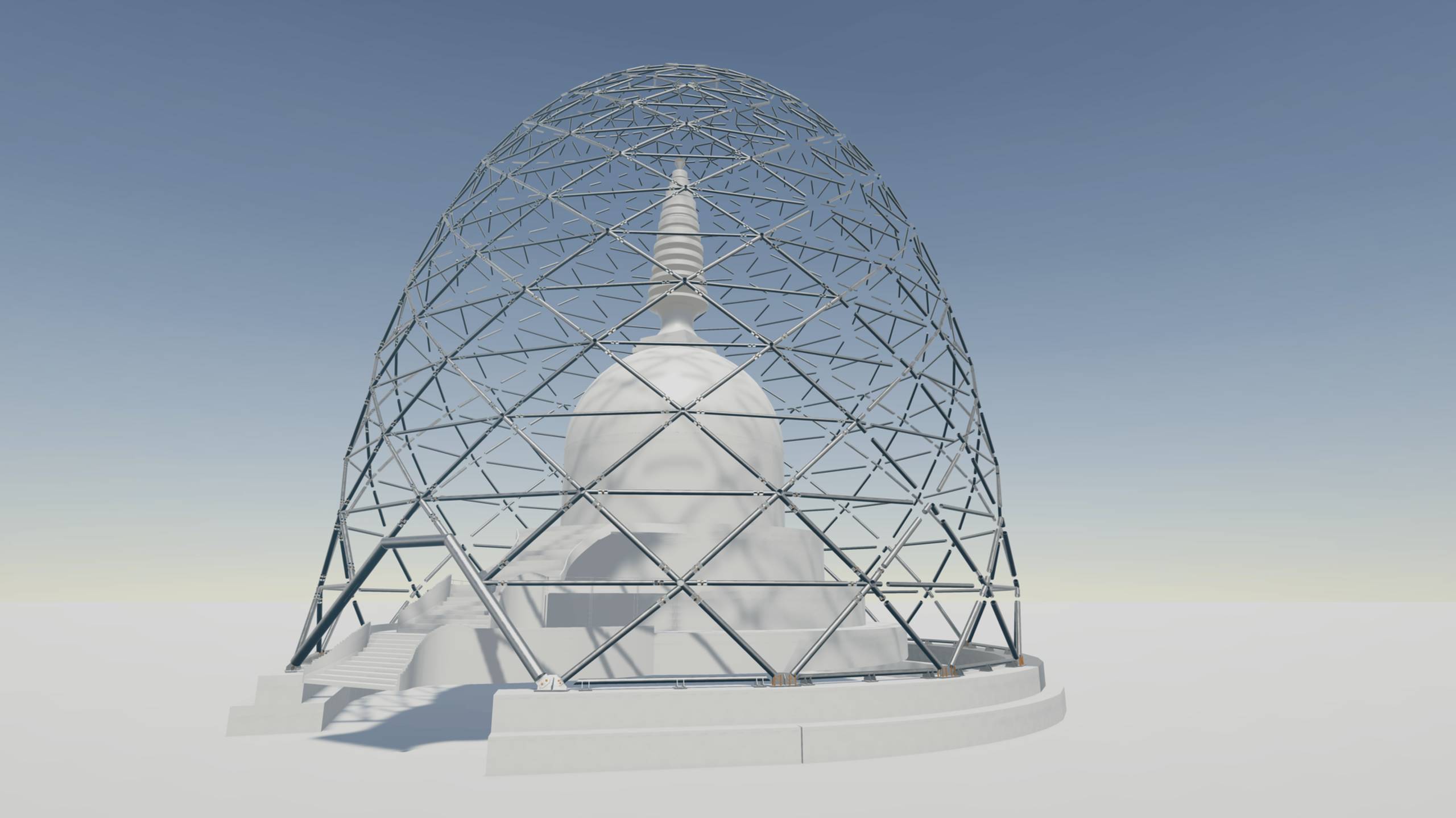 Tamás’s thesis tackled a distinctive challenge: protecting a Buddhist memorial from environmental effects. The Stupa in Zalaszántó stands 30 meters tall and 24 meters wide, and due to religious reasons, it cannot be modified. To address this, Tamás designed a protective covering to shield the structure from external damage. His final design features a steel lattice dome, onto which a glass cover is directly mounted. Using parametric design, he created a flexible script-based model that allows for easy adaptation to different geometries and configurations, enabling him to test multiple design variations in search of an optimal solution.